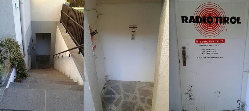 Studiobilder von Radio Tirol. Das Foto oben links zeigt den Eingang zum